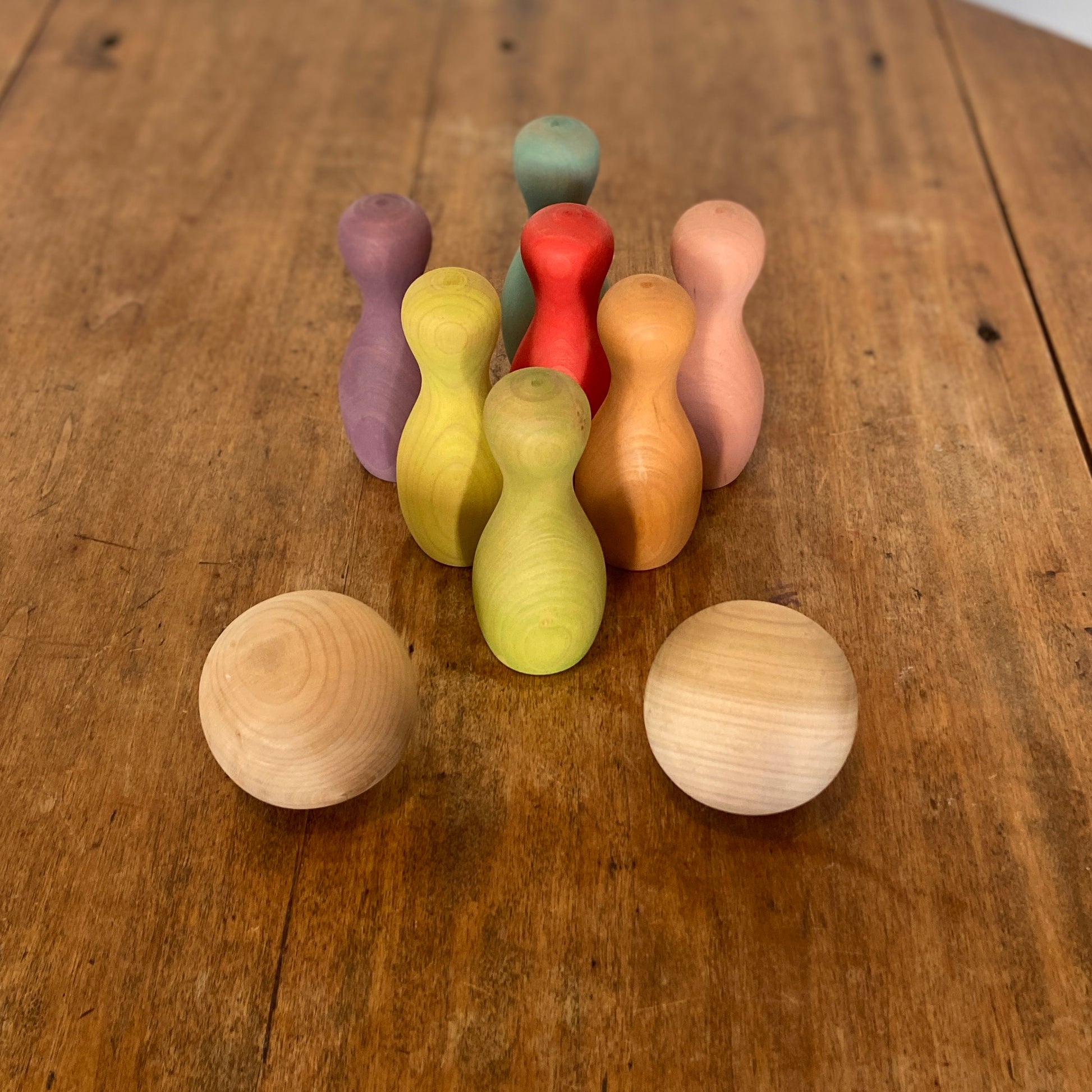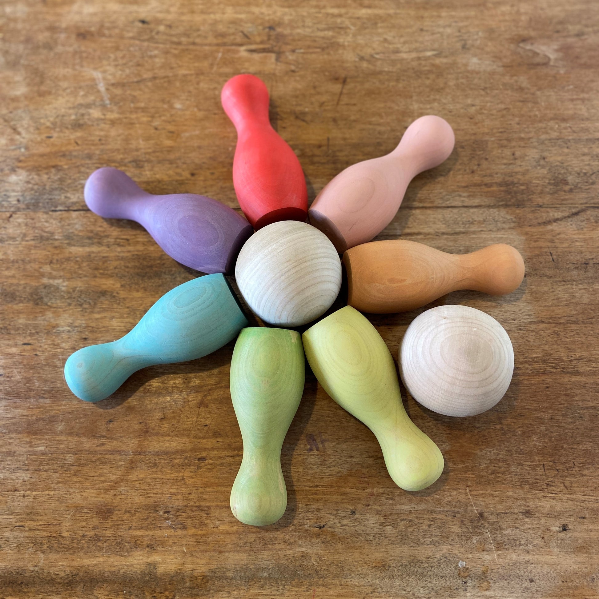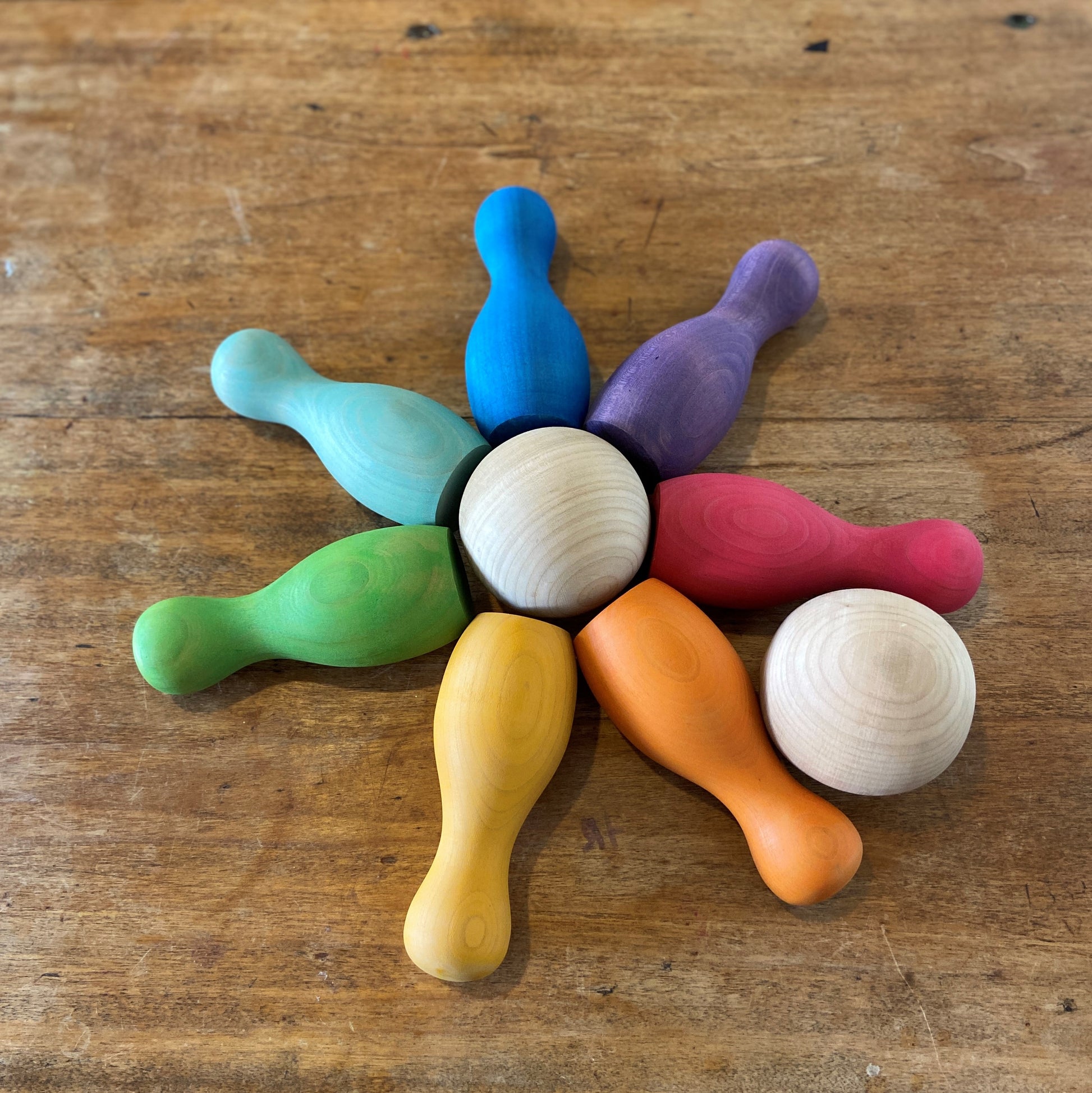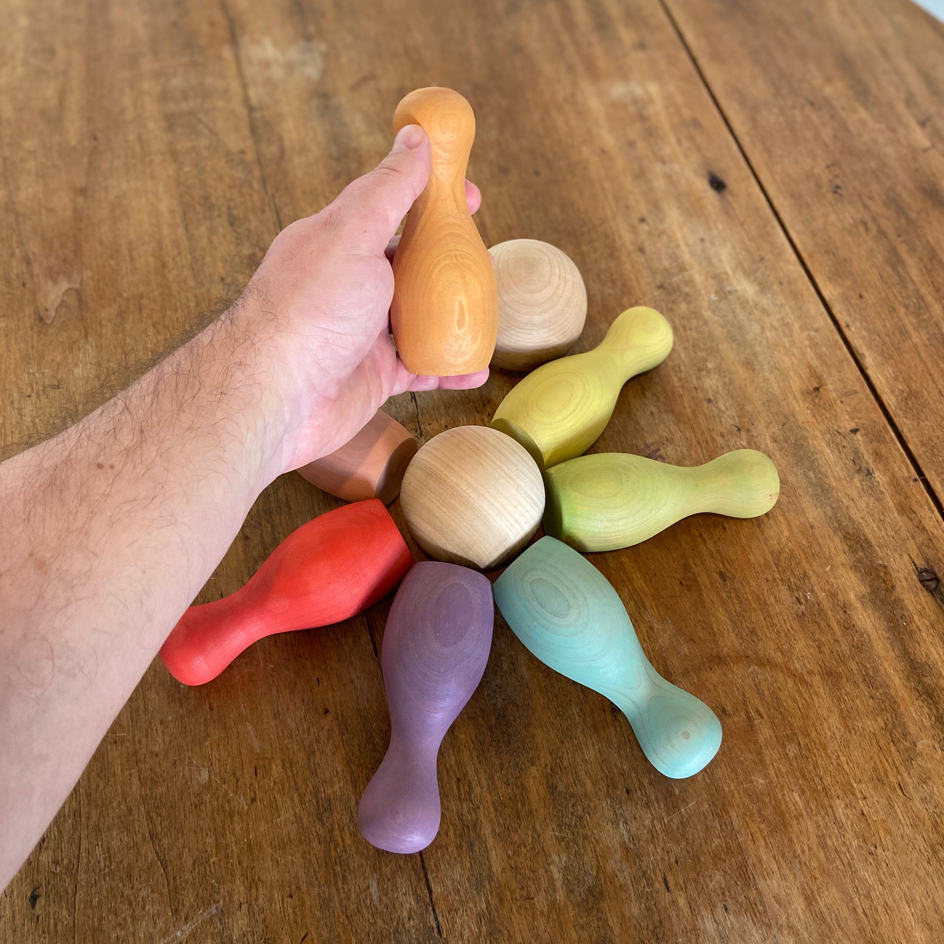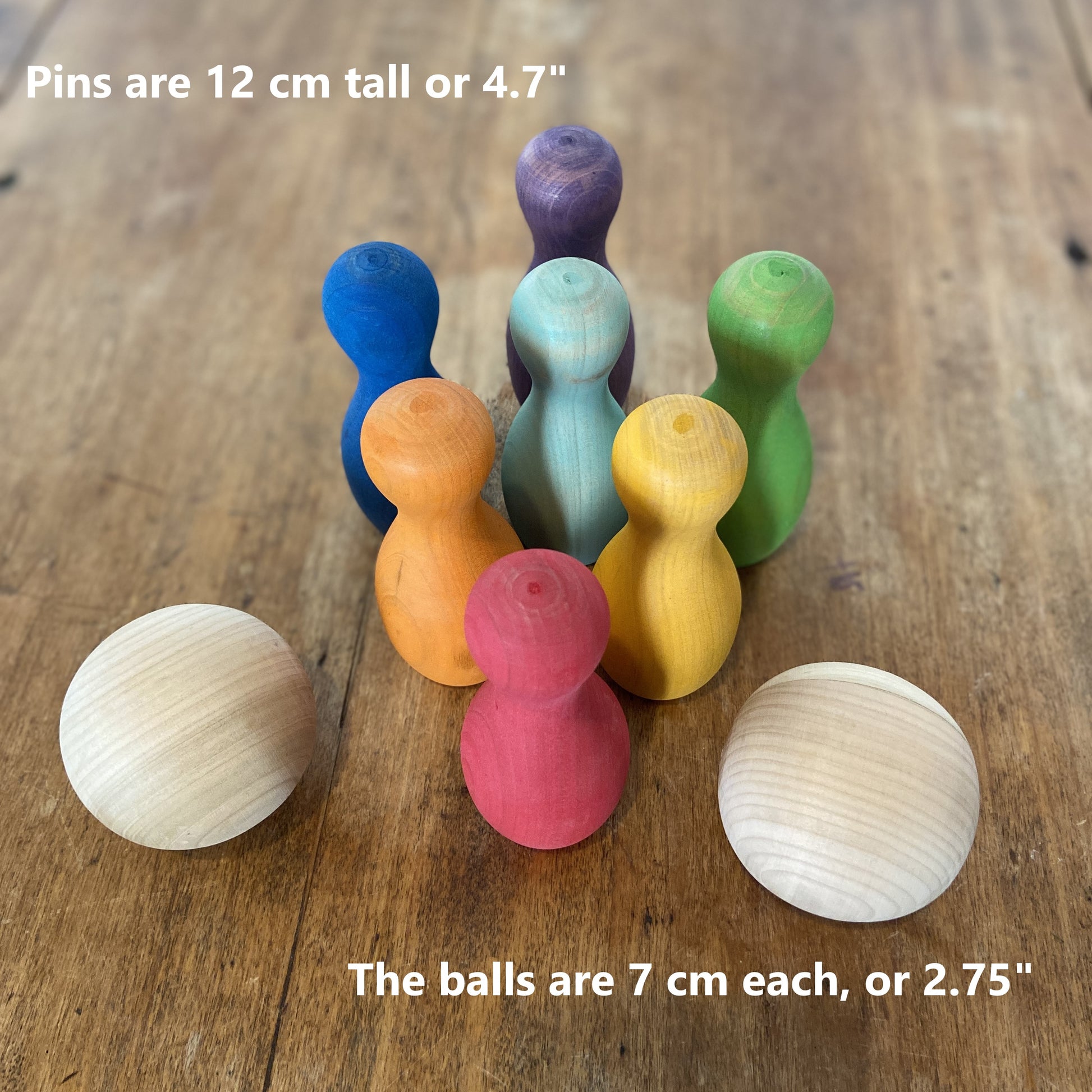 📐 SIZE: The wooden pins are 12 cm tall or 4.7" and the two balls are 7 cm each, or 2.75". You receive seven colorful wooden pins and two balls per set, and you can choose the color combination of the pins.