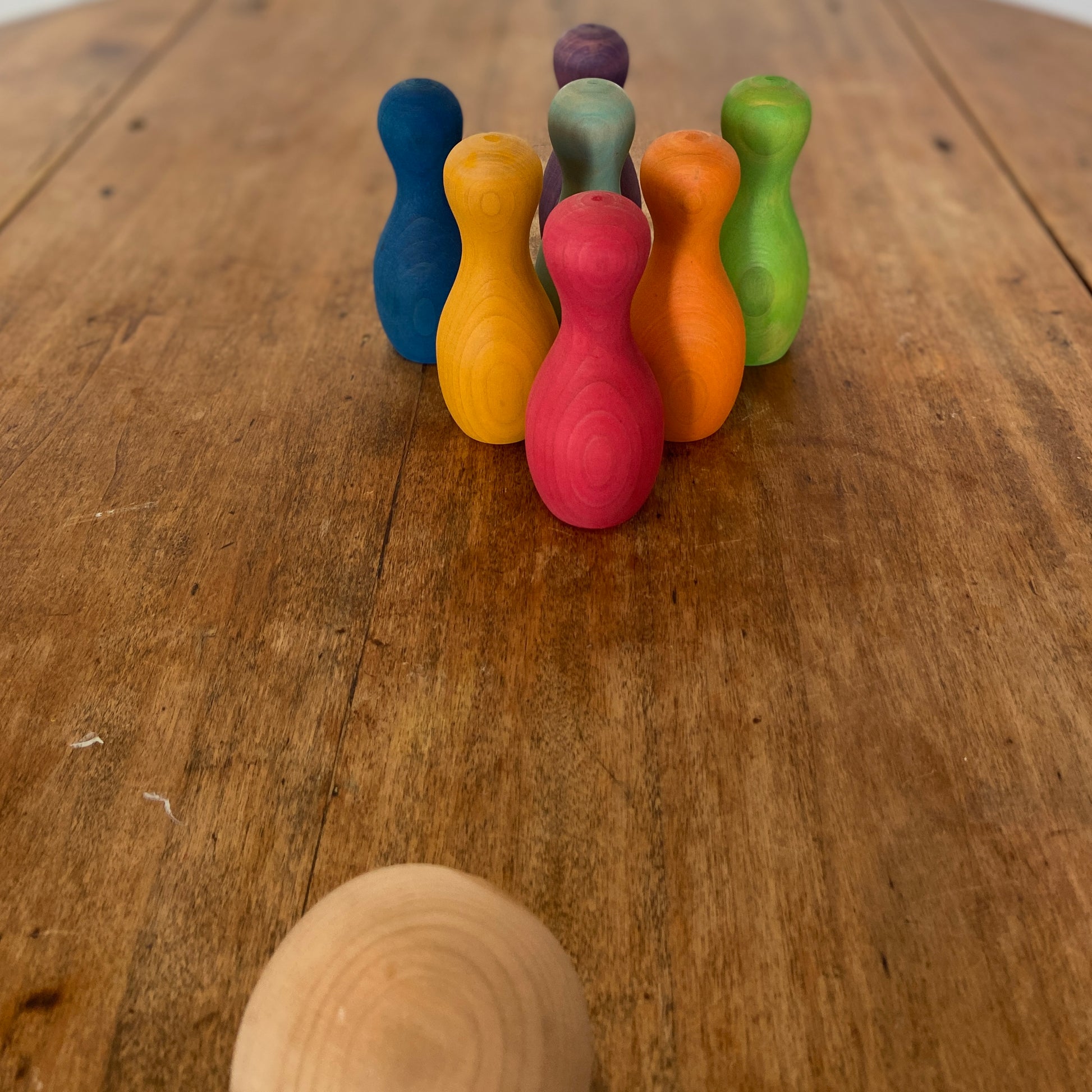 🎉 A big hit in the playroom and even at kids' parties, this wooden bowling game can be played in many different ways: classic bowling, knocking down only the designated color, color tag, etc. This wooden Montessori toy is 100% made from natural materials: cherry wood and nontoxic water-based.
