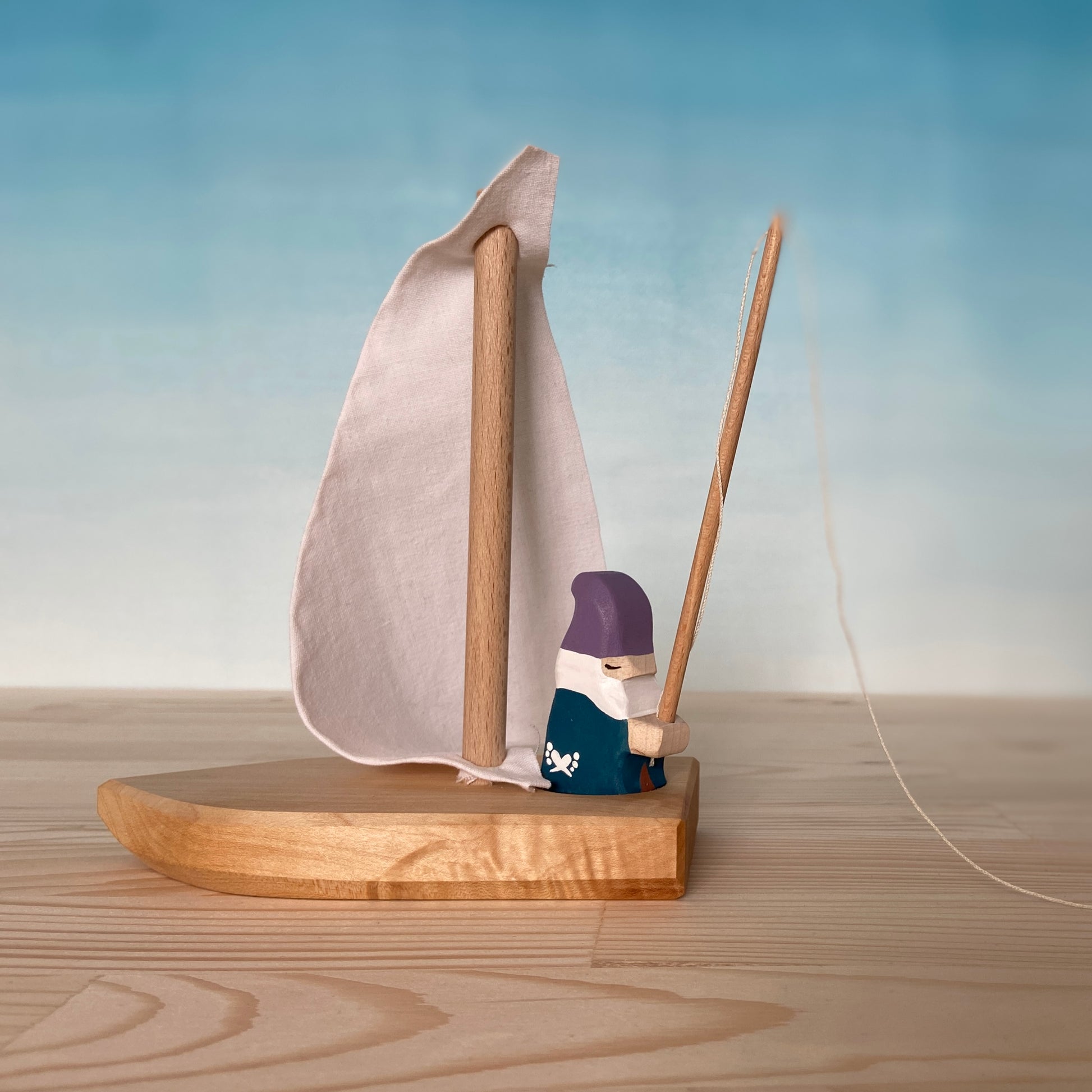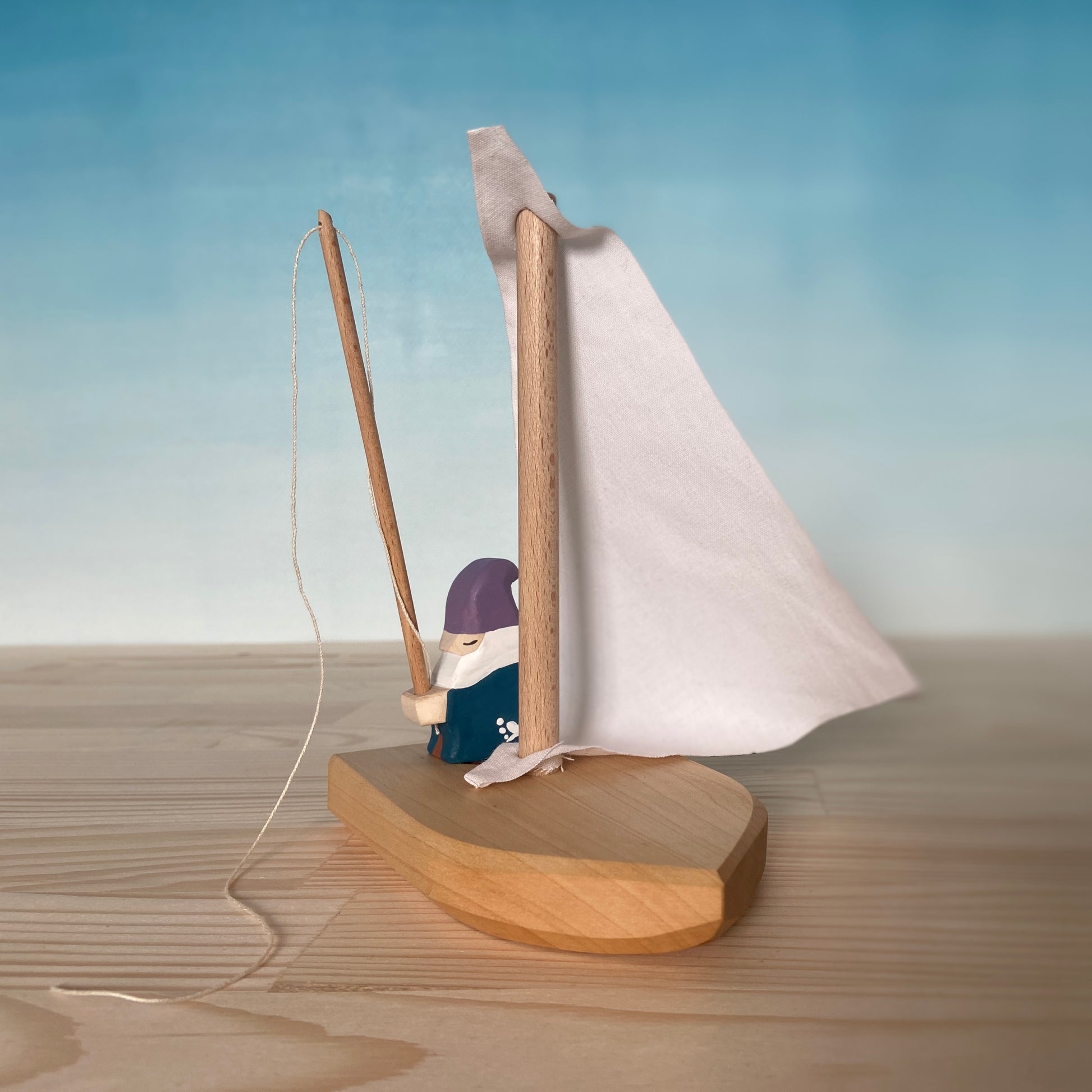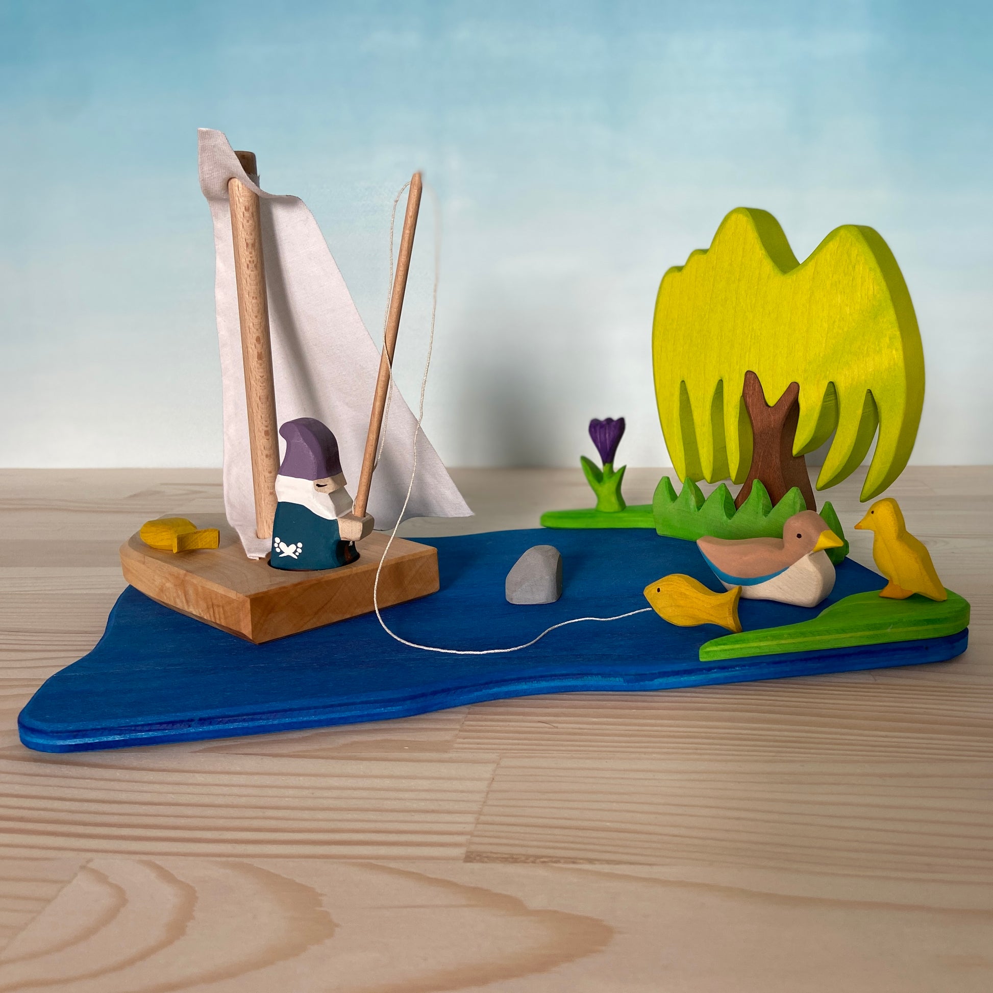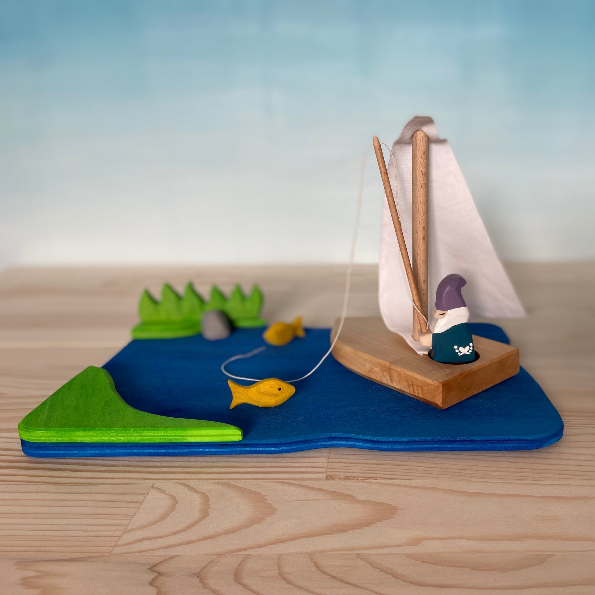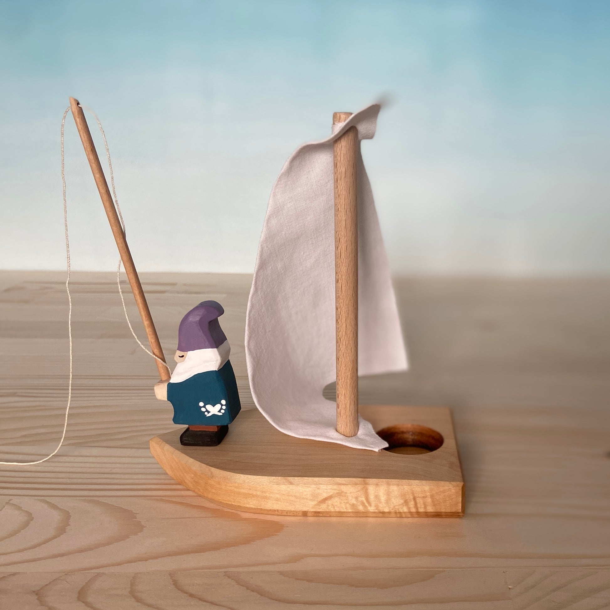 🌳 A fisherman gnome doll and his wooden toy boat, skillfully handcrafted and painted for any kids' playroom. You can also add the wooden lake plate, and the possibilities for imaginative play are endless. :)