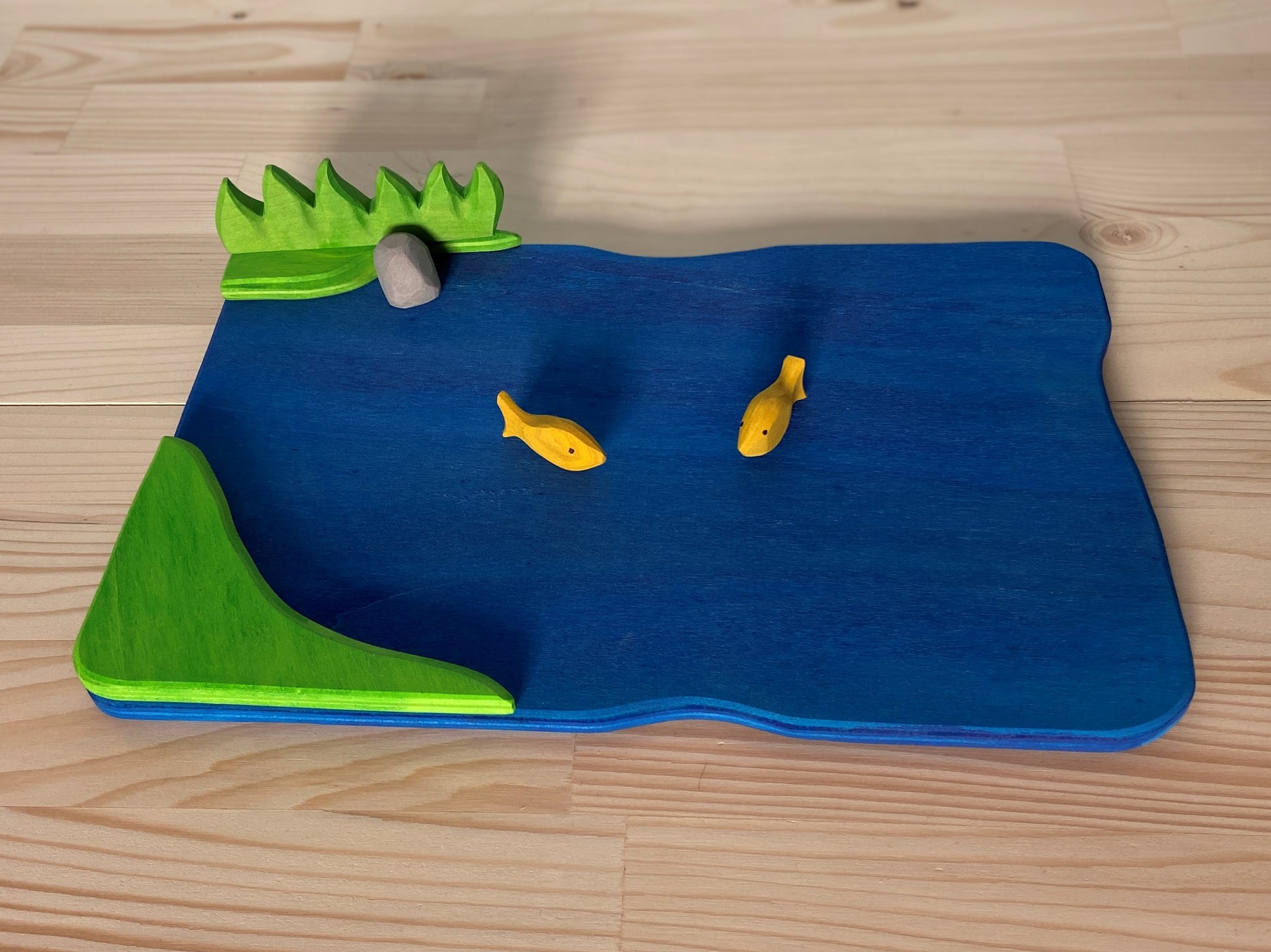 📐The gnome is 6 cm or 2.36 inches, while the boat is 12 x 8 cm (4.7" x 3.15"). The lake is 21x30 cm (8.25" x 11.8"). The grass, the rock, and the two fish are all mobile parts.