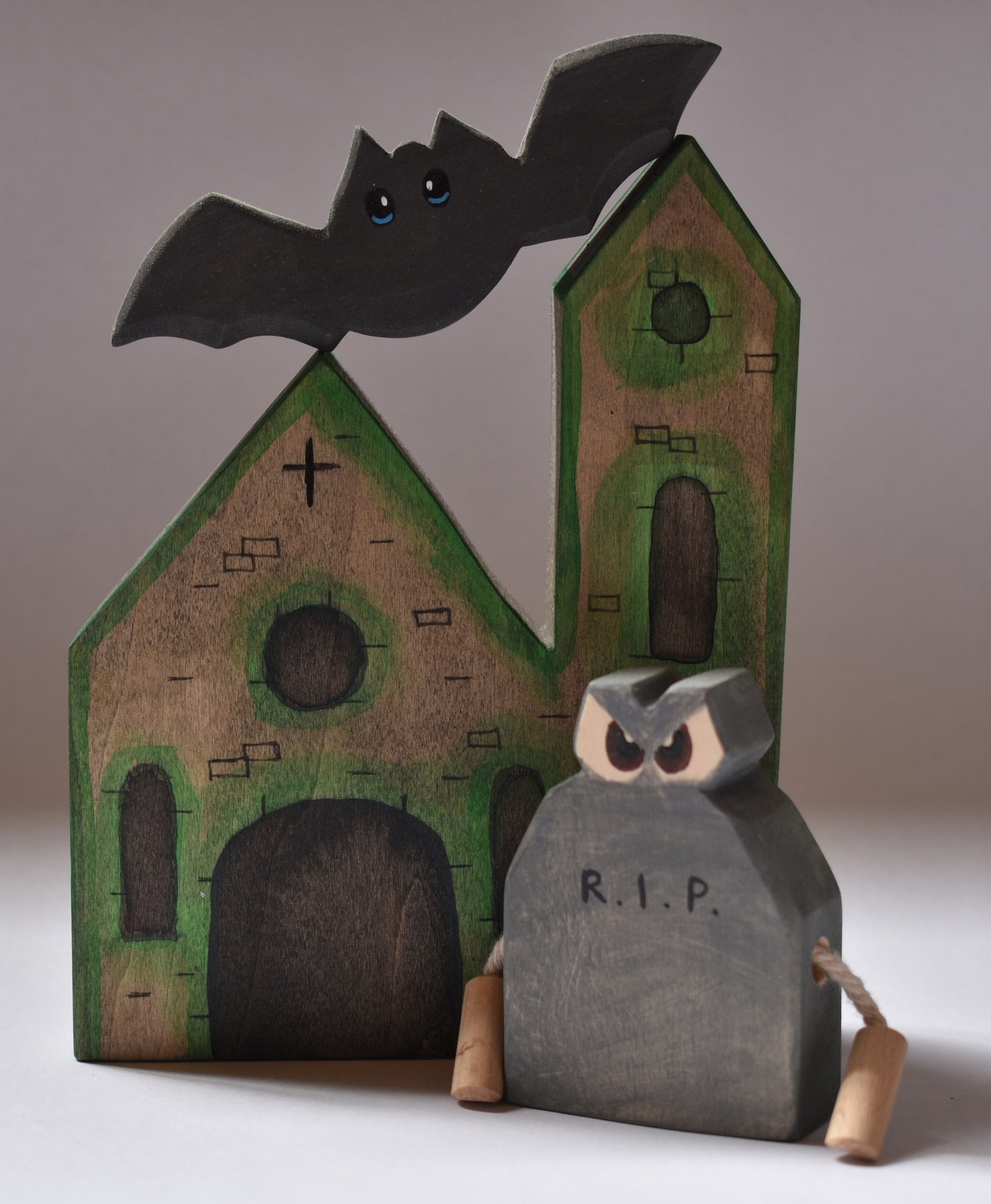 All parts of the Halloween village - wooden toy set, are hand-crafted using solid maple from Romanian domestic forestry. So as a bonus, you get wooden pieces from the land of vampires.