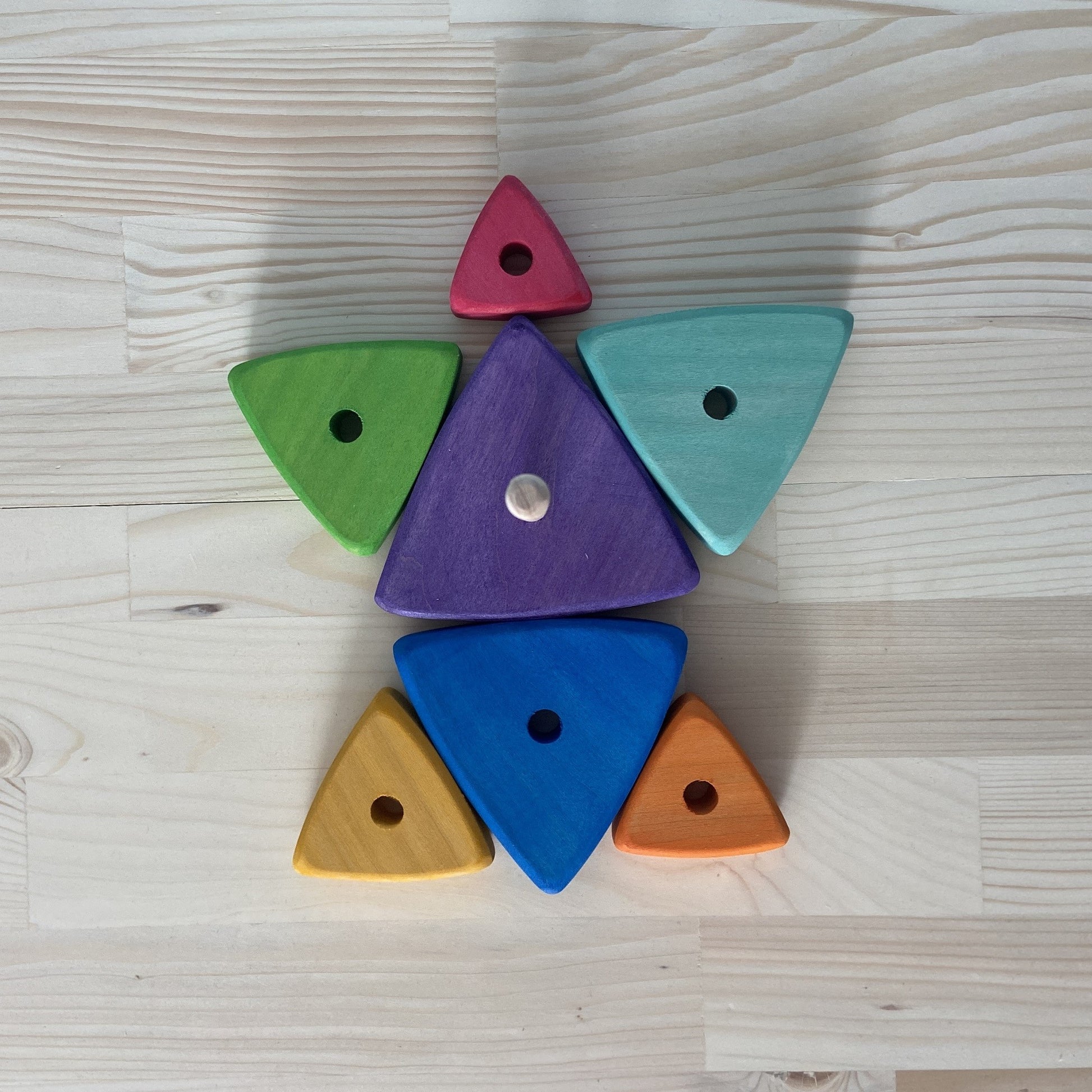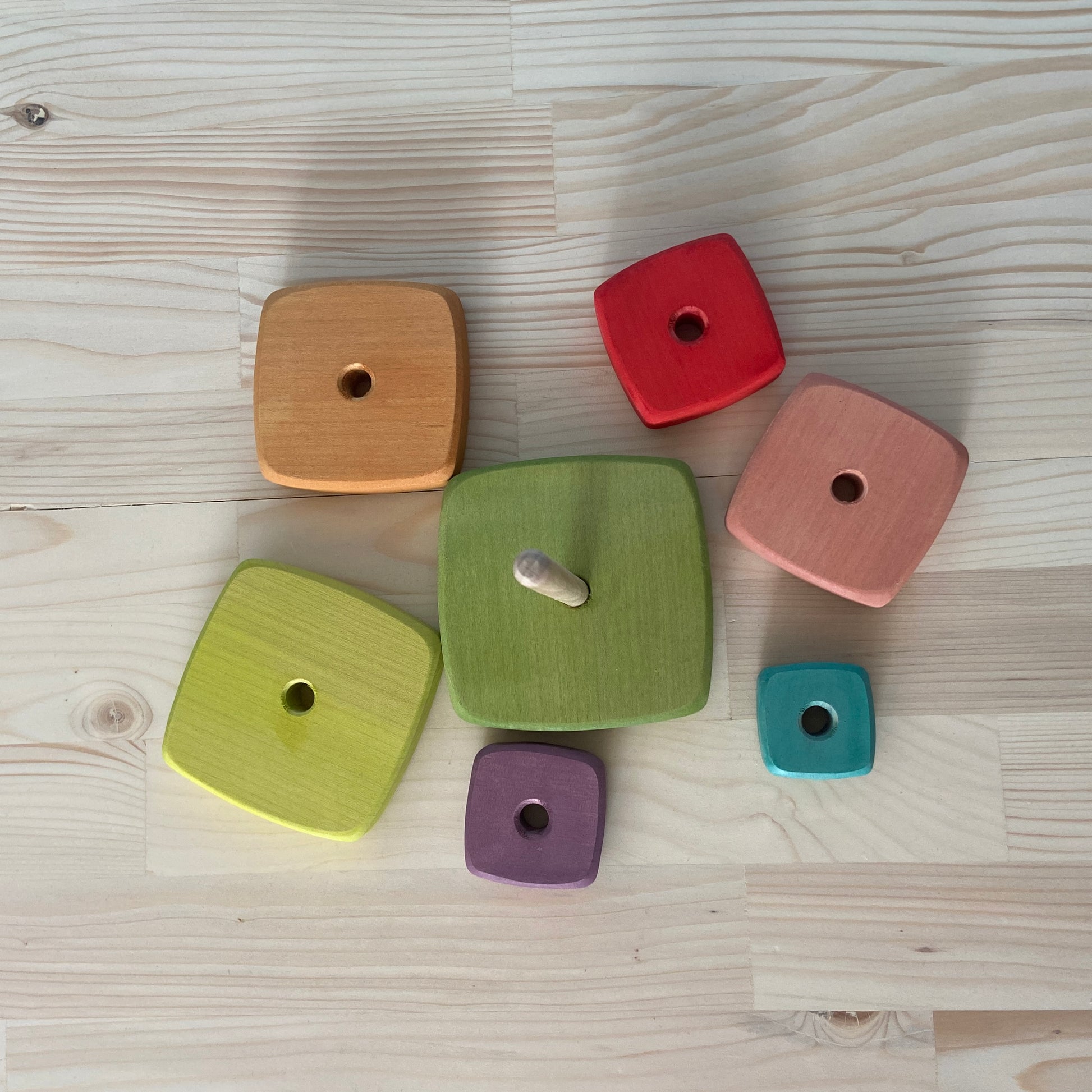 Knots, patterns, and rich grain colors are part of the natural beauty of wood and are not faults. Larger toys (rainbow stackers, for instance) are cut from a single block of wood, and you'll often see the same features continuing through the various pieces. These unique variations are proof of quality, not defects.