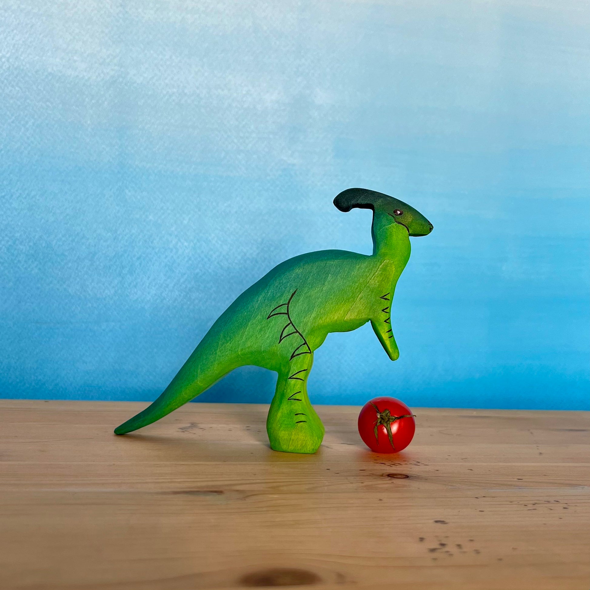- The Parasaurolophus (the one with the horn at the back of its head) is the smallest - 5.1 x 5.1 x 1.2 in or 14 x 14 x 3 cm.