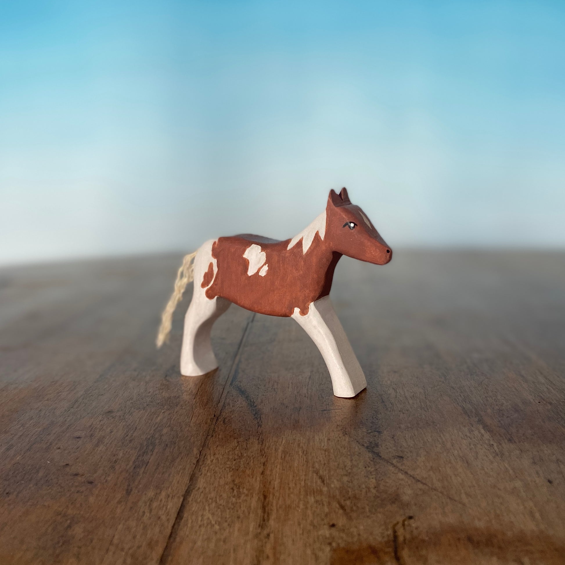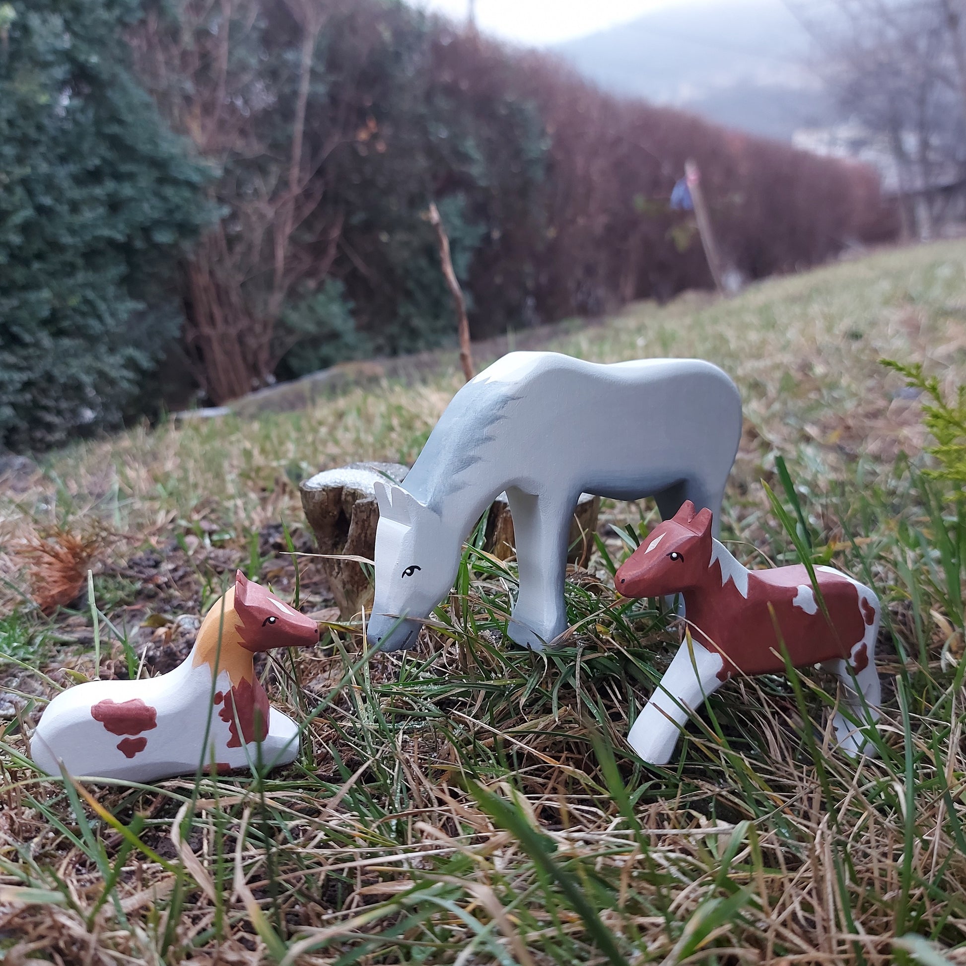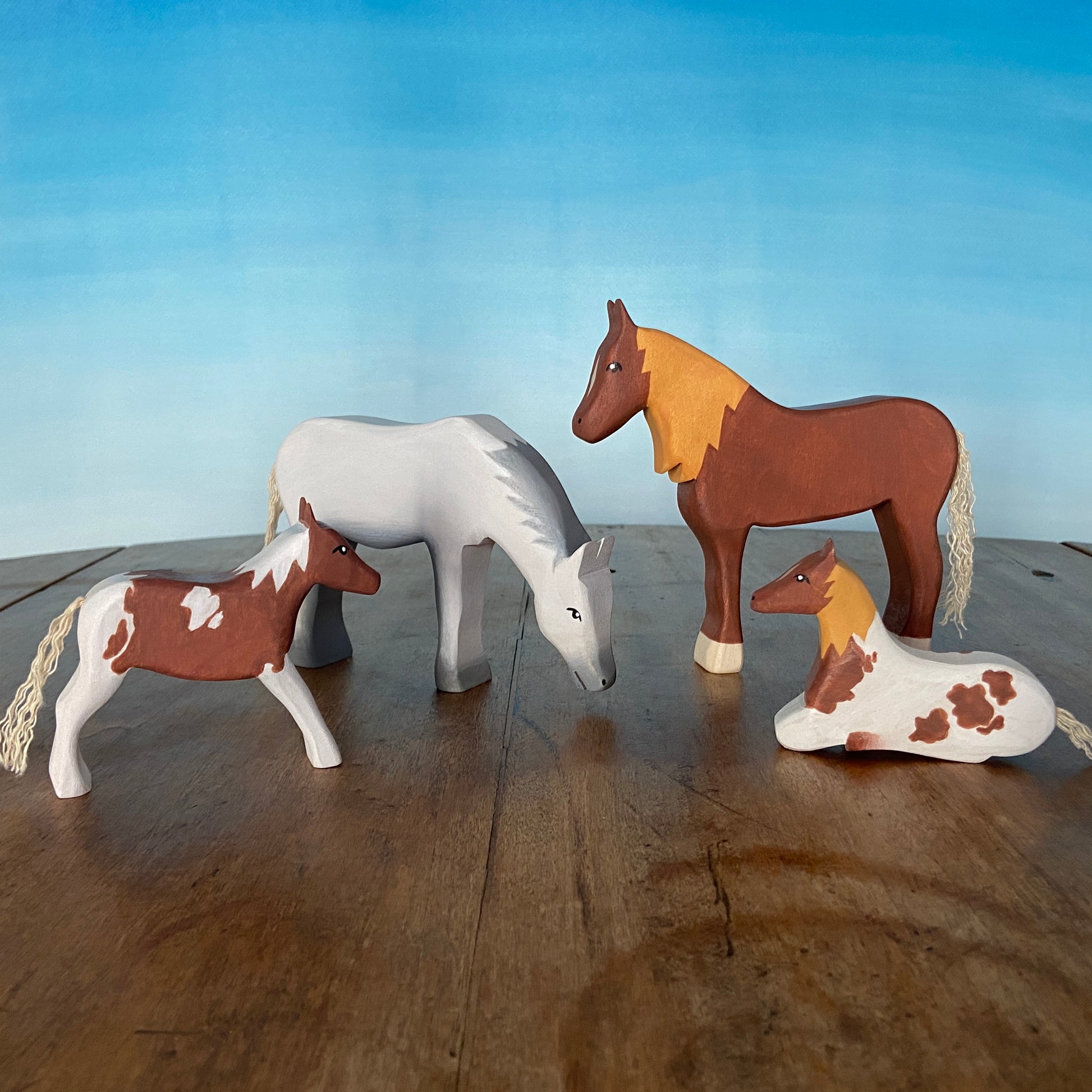❤️ Four wooden farm animals, skilfully shaped as beautiful horse figures. 🌳 The Waldorf toys are made from Sycamore maple and painted with certified non-toxic water-based paint. Each figure is sanded and shaped to resemble the real animal as much as possible.
