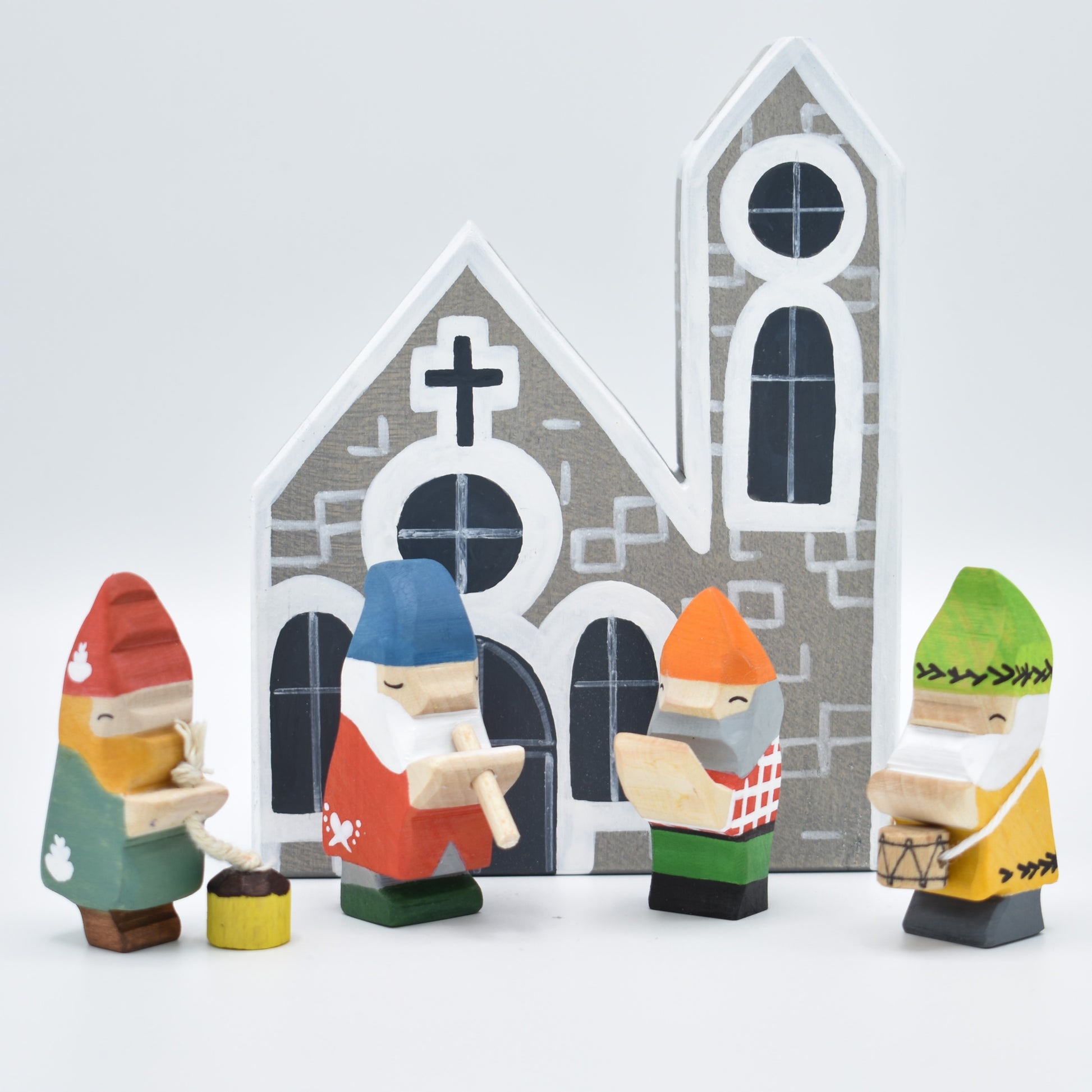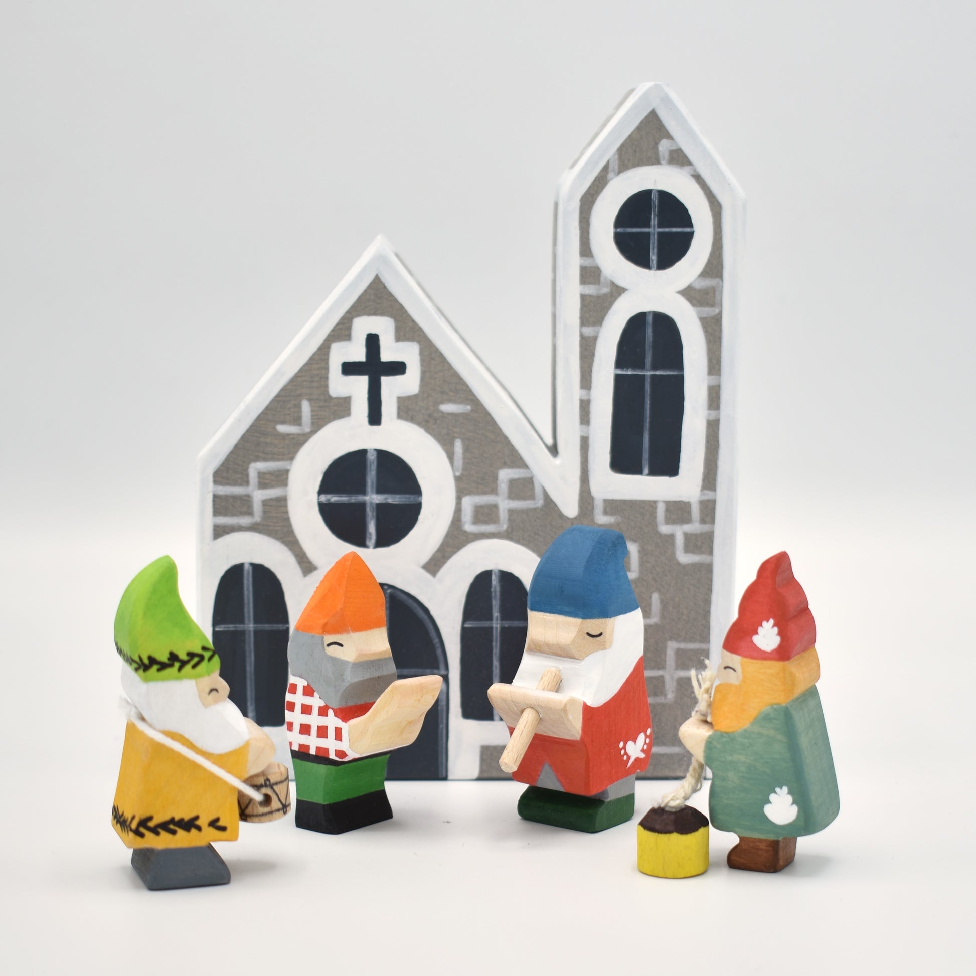 🌳 Our well-known wooden gnome figurines with a fresh change of clothes in the holiday spirit. Skillfully handcrafted and painted for any kids' playroom, the possibilities for imaginative play are endless. The gnomes are singing carols in front of the winter church.