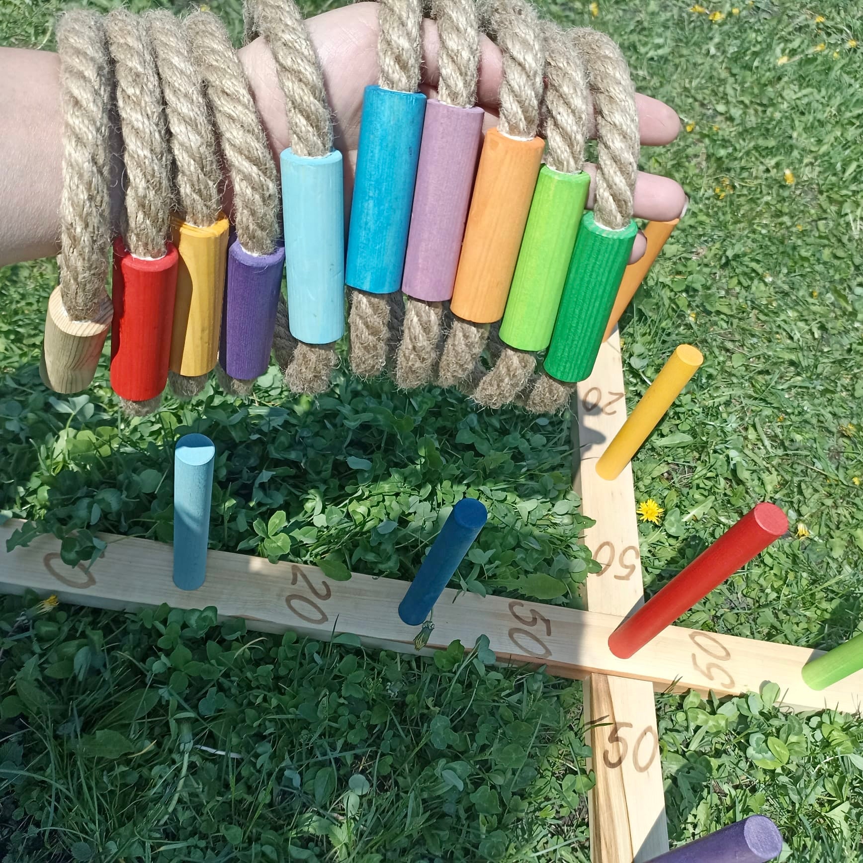🎊🎉 A big hit at parties, reunions, weddings, or other special events. You can even play inside, in your playroom or living room. This wooden game is 100% made from natural materials: wood and jute rope. The paint is non-toxic and water-based.