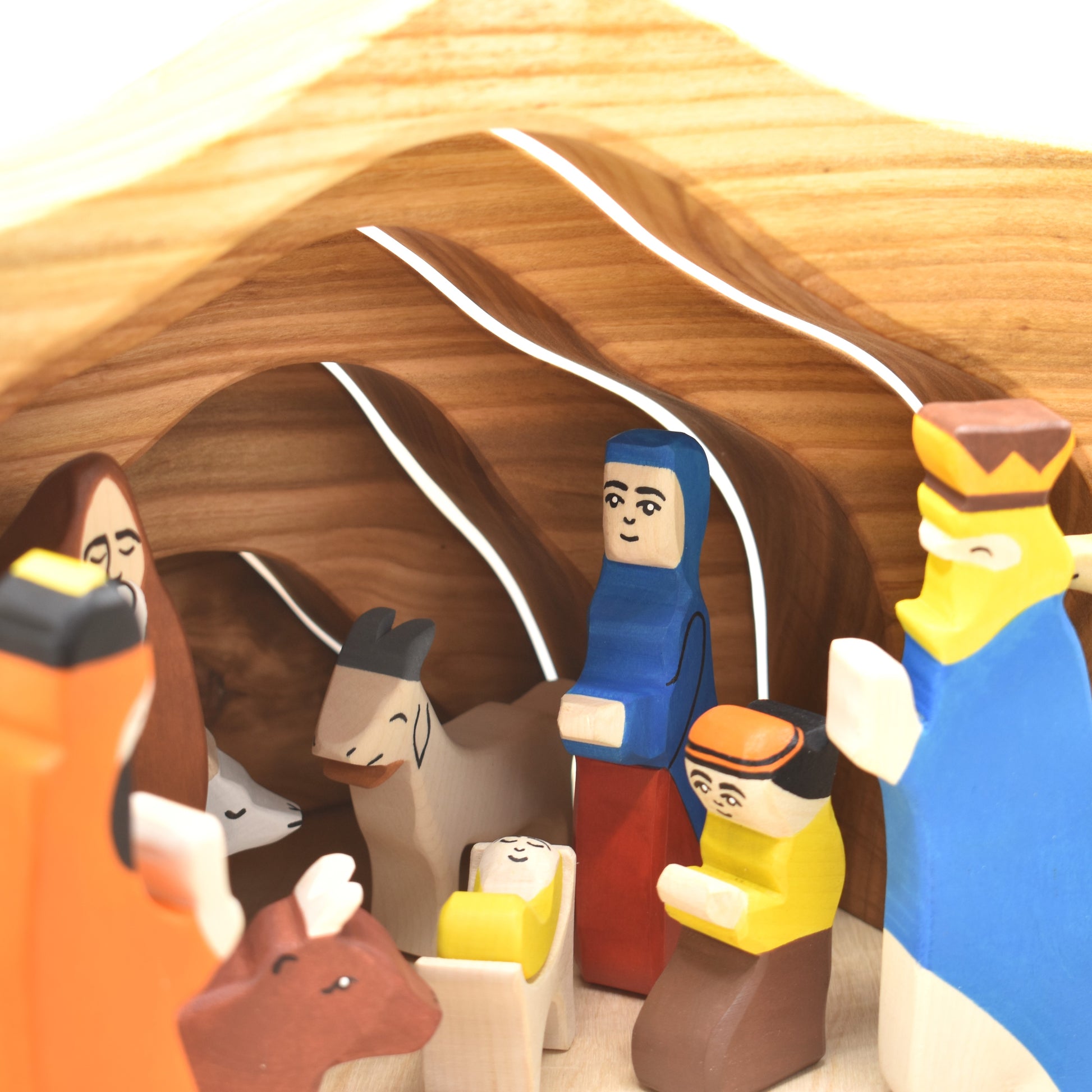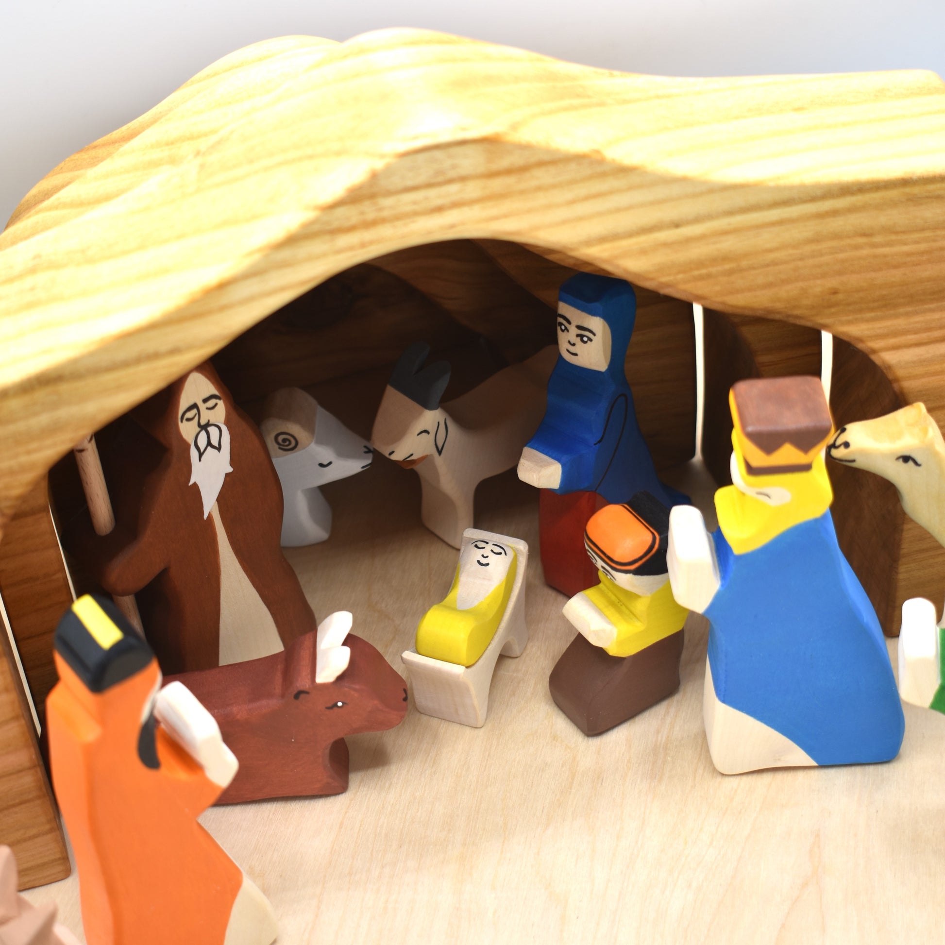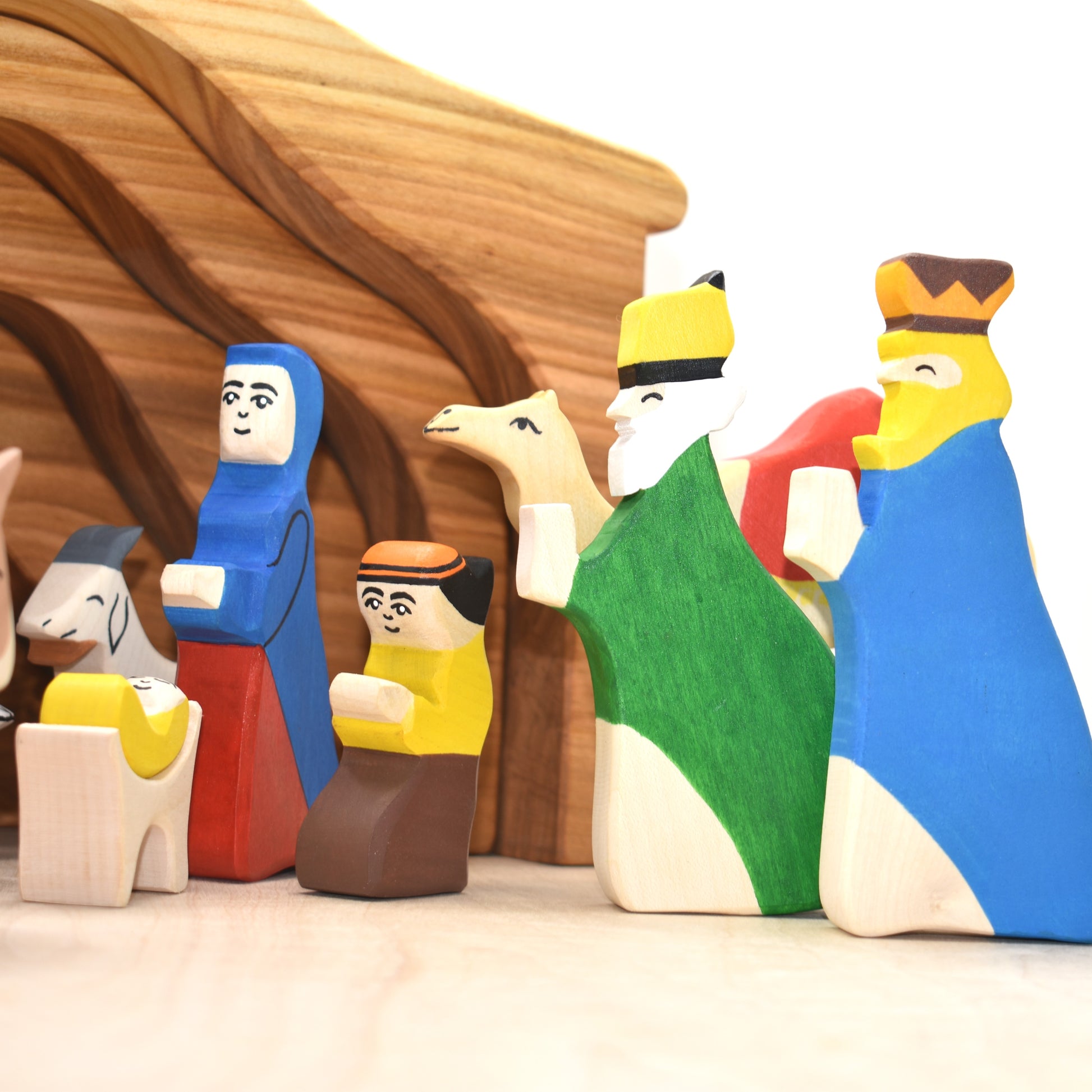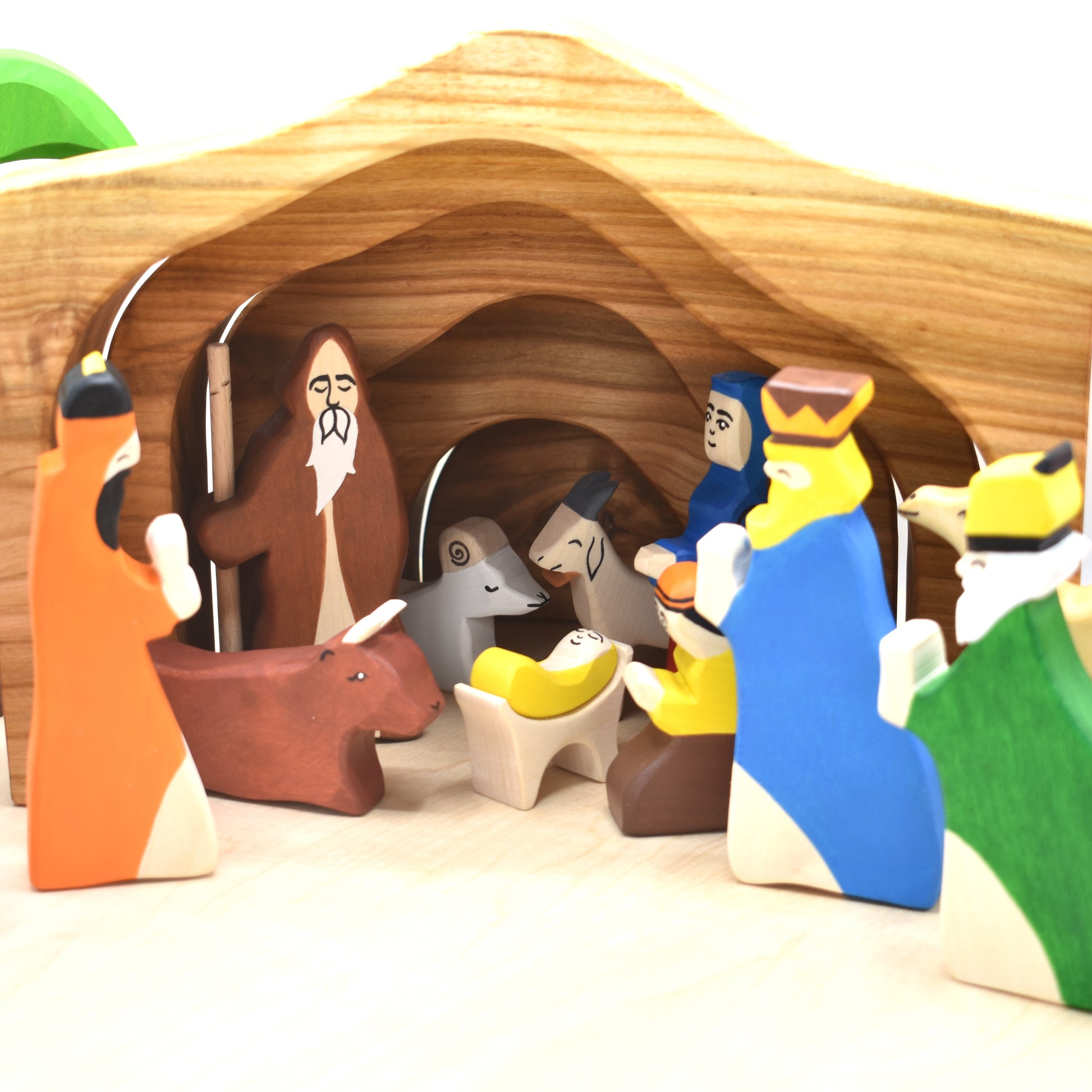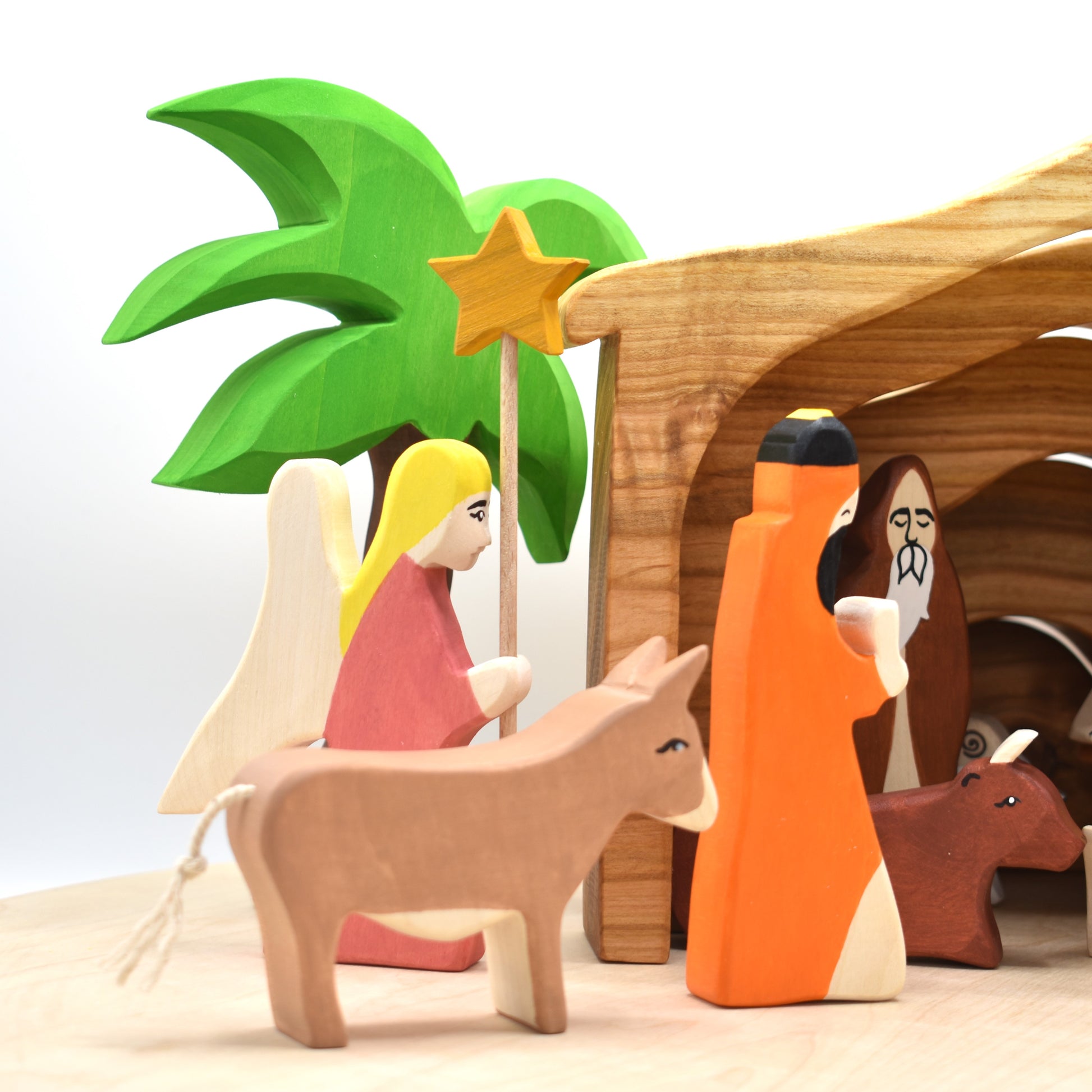 ❤️ Our new 15 pieces Waldorf Nativity set scene consists of a stable, hand-cut from solid cherry wood, Mary, Joseph, baby Jesus with a Crib, an angel with a star, three kings, an ox, an ass, a praying Shepperd, a goat, a ram, a camel, and palm tree.