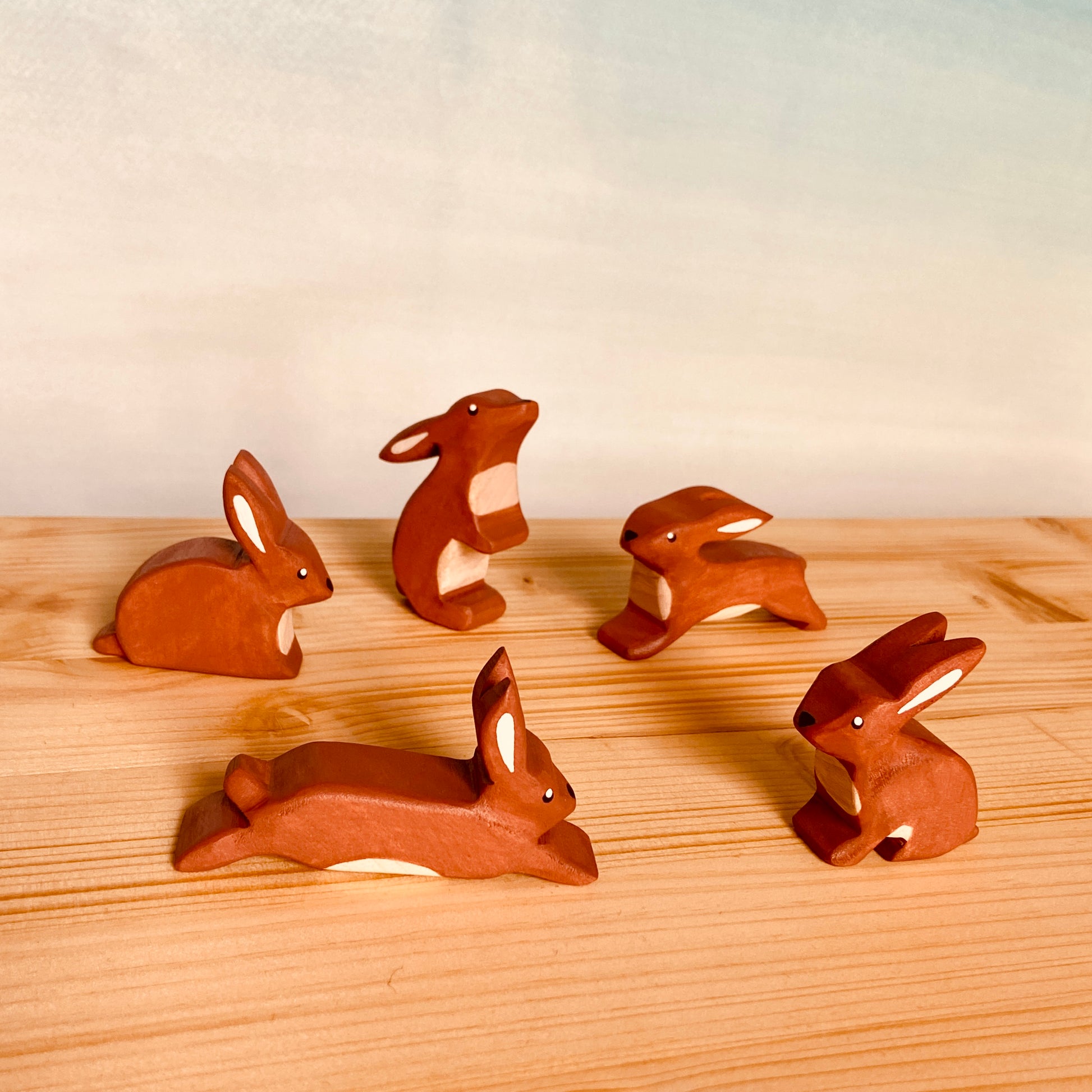 🌳 Our wooden animals are made from maple and painted with certified non-toxic water-based paint and pure linseed oil. Skilfully shaped like rabbits, these five wooden toys are based on the principles of Steiner education. The Waldorf toys are meant to teach the name of each animal, its shape, size, color, where it lives, and what it eats.